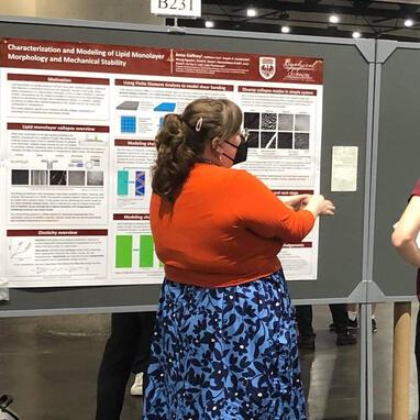 In my research as a grad student, I study how lipid monolayers at the air-water interface collapse under compression. I combine experimental lipid monolayer research (through fluorescence and atomic force microscopy conducted in the Lee Lab) with computational continuum mechanics modeling (through finite element simulations in the SurgBioMech Lab), to characterize the morphology and mechanical stability of lipid monolayers undergoing collapse.